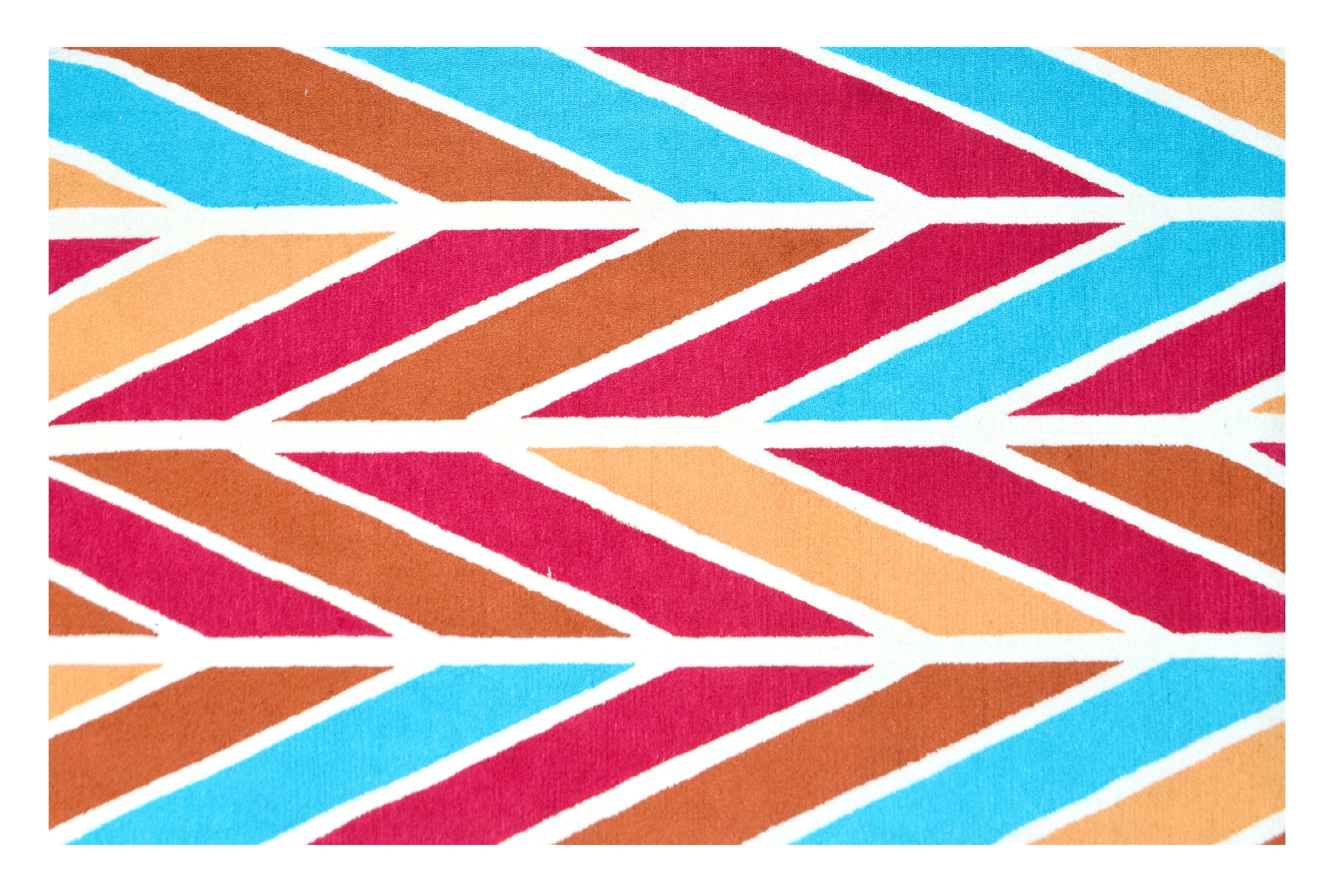 - Design: A geometric chevron pattern with alternating diagonal “V” – shaped segments in bright blue, vivid magenta, orange, and terracotta, separated by white accent lines.