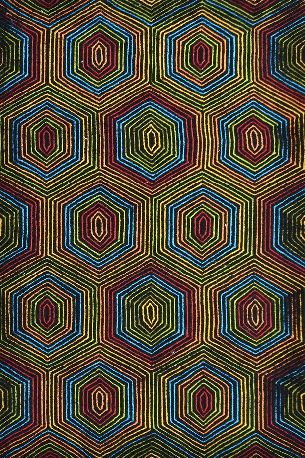 - Design: Hexagonal Geometric pattern with concentric, layered stripes and repeating hexagonal motifs, featuring an inner “target-like” pattern and an outer hexagonal border.