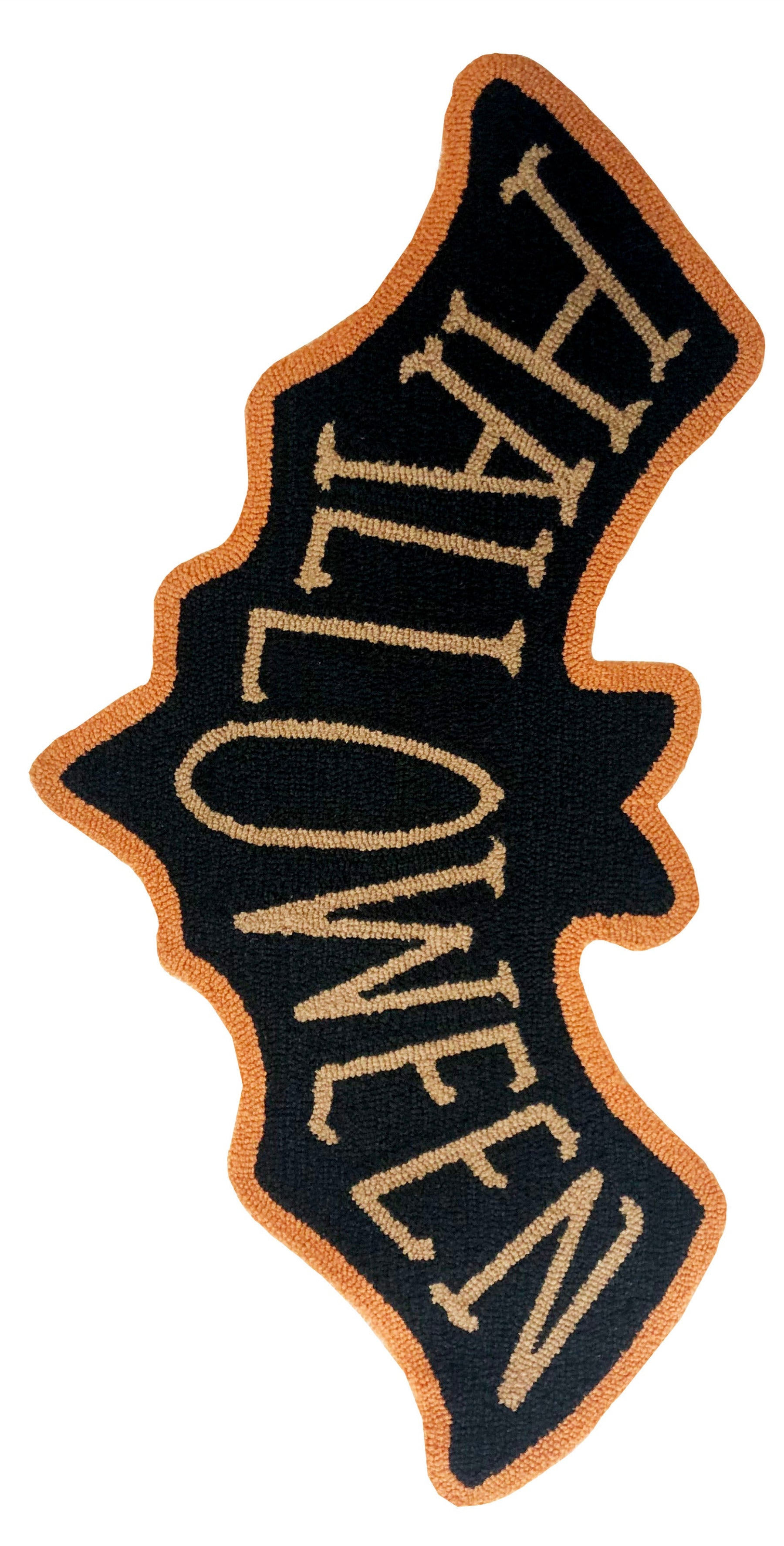 Enhance your Halloween decor with this charming novelty area rug. Shaped like a bat, it features a bold two – tone color scheme of black and orange, with light beige text spelling “HALLOWEEN” across the body. Made from either polypropylene or cotton, it has a low to medium pile for a smooth yet textured surface.