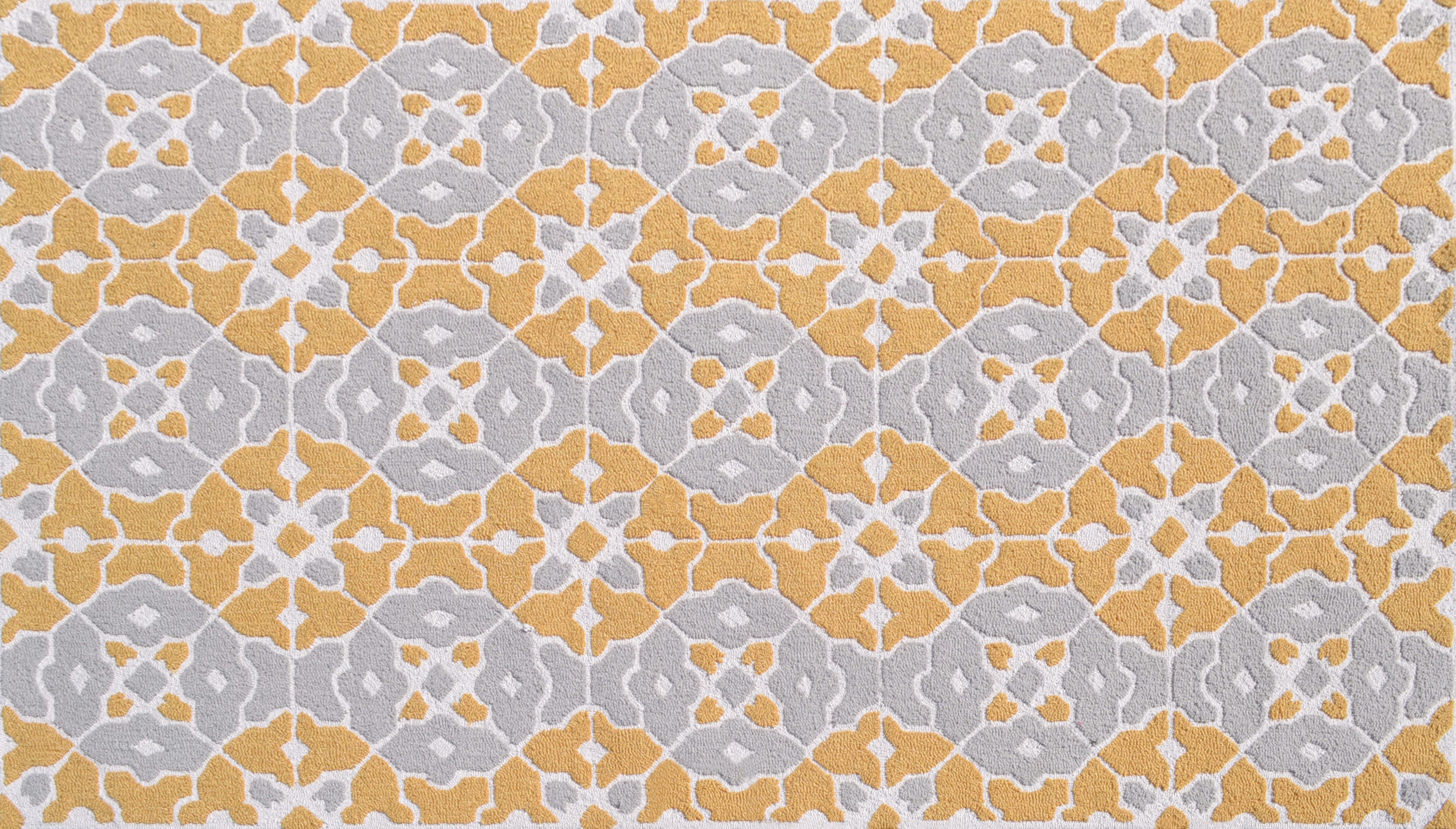 - Design: A modern geometric pattern with repeating interlocking diamond/lozenge shapes and central dots, featuring warm yellow accents on a light gray and white base.