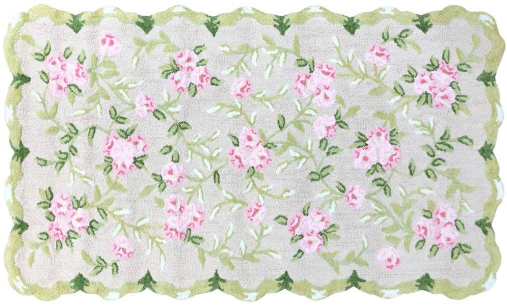 This beautiful area rug features a traditional floral pattern with pink blooms and green foliage on a cream/ivory background. The soft pastel color scheme and decorative scalloped green border add a vintage, romantic touch to any room. Made from synthetic fibers, it has a plush, velvety texture.